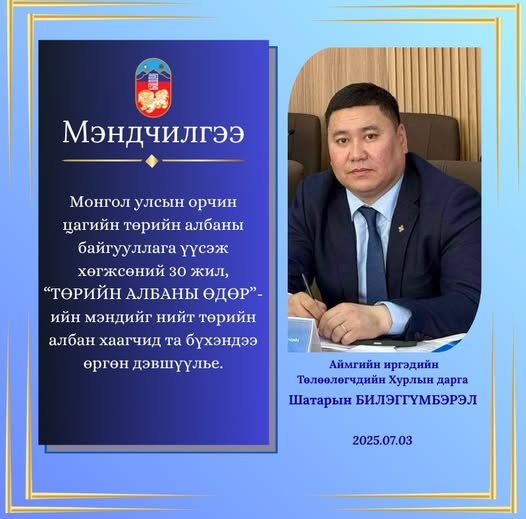 ТА БҮХЭНДЭЭ “ТӨРИЙН АЛБАНЫ ӨДӨР”-ИЙН МЭНДИЙГ ӨРГӨН ДЭВШҮҮЛЬЕ.