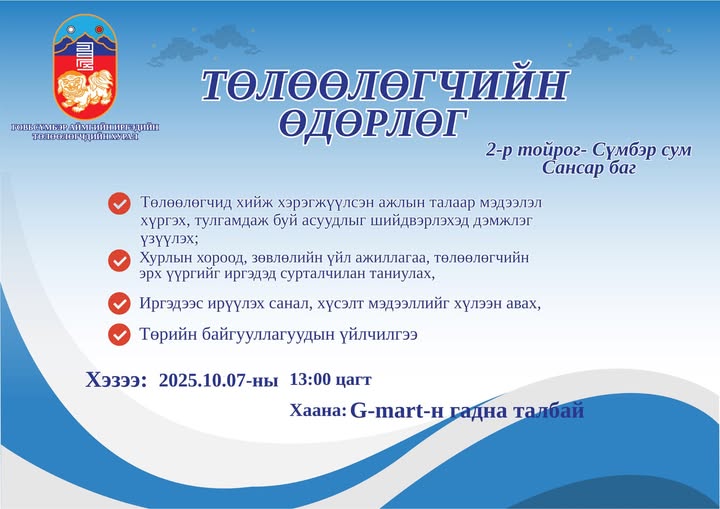 Аймгийн Иргэдийн Төлөөлөгчдийн Хурлаас "ТӨЛӨӨЛӨГЧИЙН ӨДӨРЛӨГ"-ийг хуваарийн дагуу зохион байгуулах гэж байгаа тул иргэд, албан байгууллагуудыг идэвхитэй оролцохыг уриалж байна.