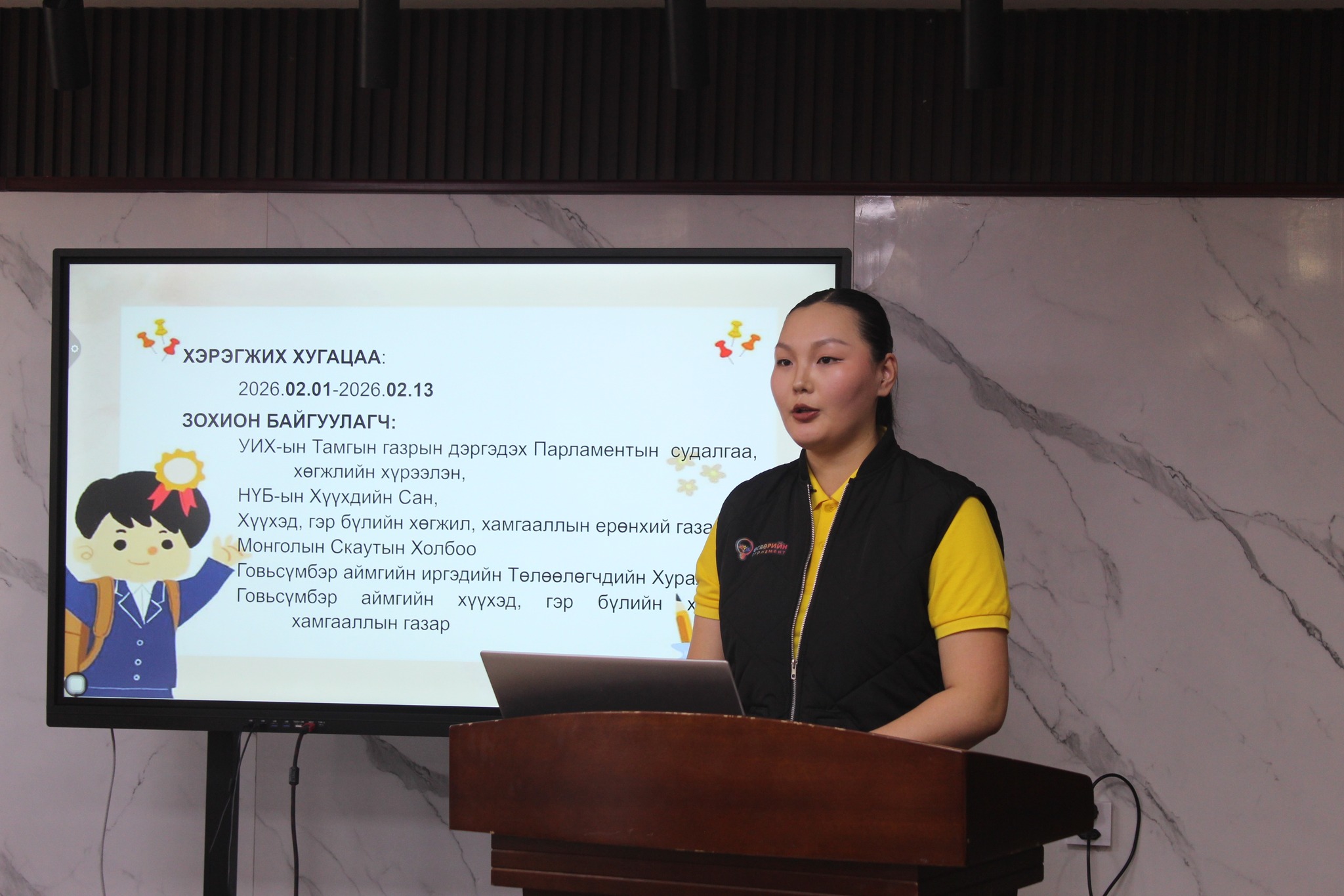 Нээлтээр Говьсүмбэр аймгийн хөтөлбөрийн оролцогч Шивээговь сумын 3 дугаар сургуулийн 12б ангийн сурагч хөтөлбөрийн талаар танилцуулга хийлээ.